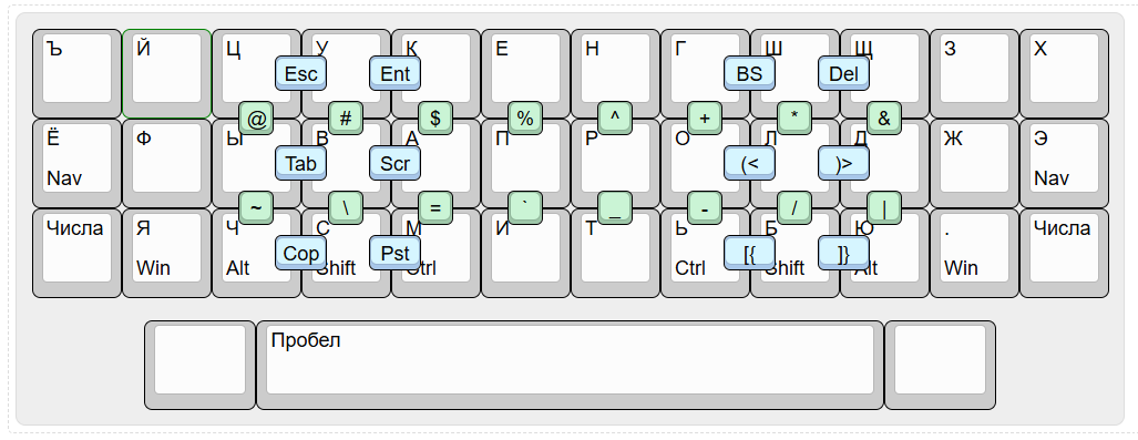 На прикрепленной картинке изображён базовый слой, слой для печати. Как видно, это самая обычная кверти с парой изменений: Ъ, Ё перенесены под левый мизинец, таким образом при печати на кириллице мне не нужно переносить палец дальше чем 1U (U есть юнит, размер стандартной клавиши, ~19mm). Ну, точнее ~1.41U к Ъ, whatever. Кстати, как вы заметили, в отличие от одного жентельмена с голубыми волосами, букву Ё я очень люблю и стараюсь использовать везде где можно. Кириллица, разумеется, к раскладке не имеет отношения, слой я изобразил с ней для наглядности.