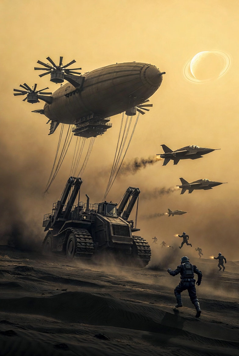Белая точка Солнца медленно, почти лениво пересекает половину мутного, жёлто-оранжевого неба и уже почти касается края огромного диска Сатурна, висящего над горизонтом тяжёлым, размытым шаром. Скоро затмение — привычное, регулярное, когда на несколько минут всё вокруг тонет в густой, непроглядной мгле. Даже мощные прожектора махолётов не сразу пробивают эту тьму, и тогда весь мир словно затаивает дыхание.